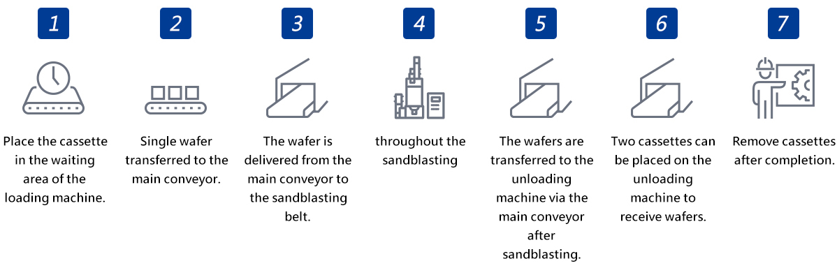 - Barcode reader function, distinguish cassette lot number and barcode, auto-adjust sand blasting pressure, belt/swing arm speed, and nozzle quantity.